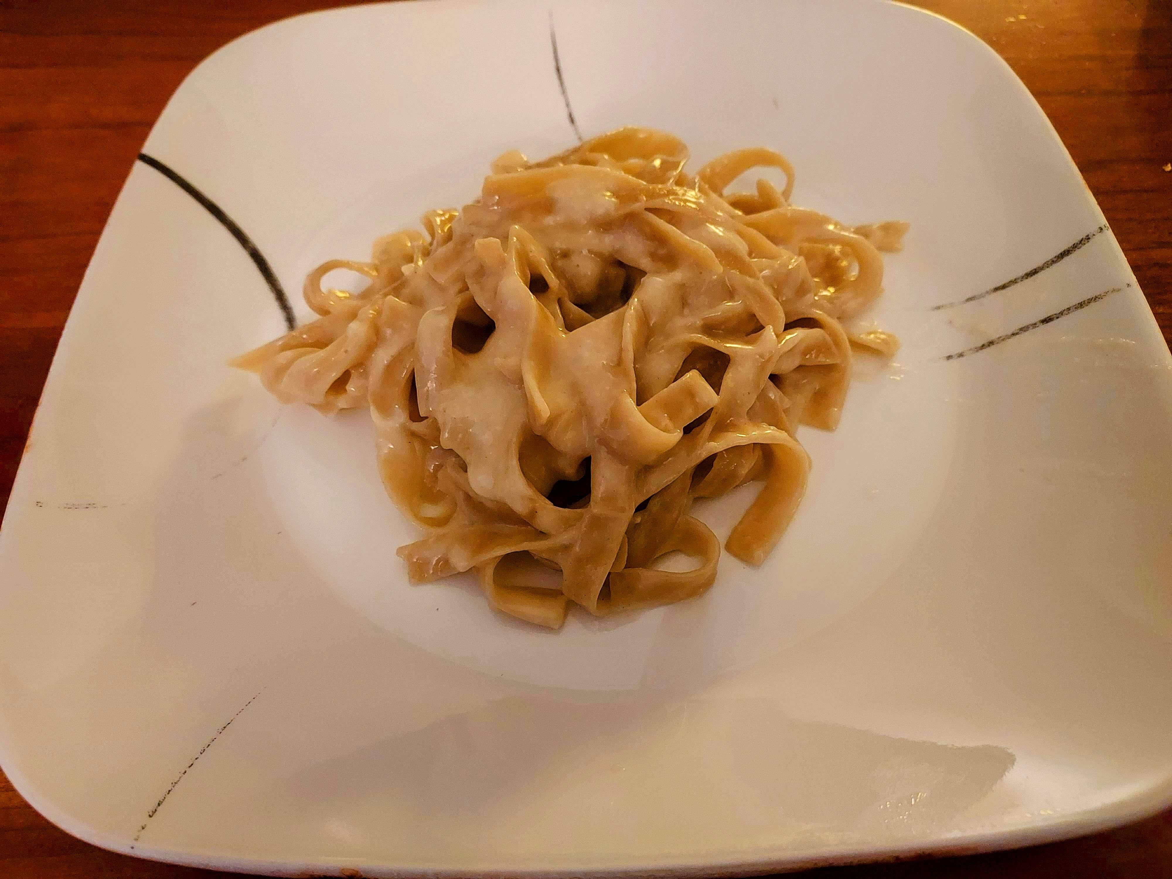Not my usual fare, since high-carb foods and I don’t play well. A recipe video reminded me that the original alfredo sauce recipe had no cream or other spices. It’s really intended as a quick meal for one or two people, no leftovers, and cream or additional things would just complicate it.